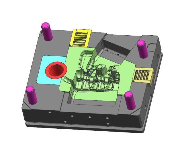 1. 此項目屬汽車曲軸箱模具,產(chǎn)品氣密性要求比較嚴格,模具入料方案采用在壁厚位置撘底的方案;